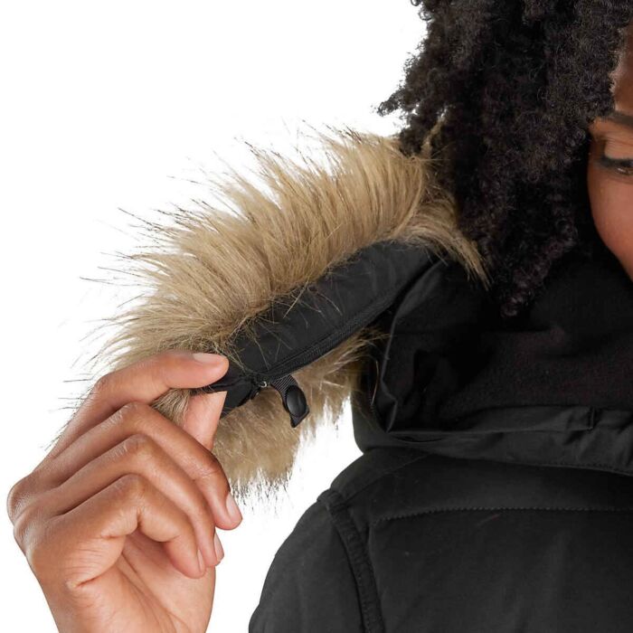 - Hidden hood drawcord with cord lock for an adjustable fit; Detachable faux fur on hood