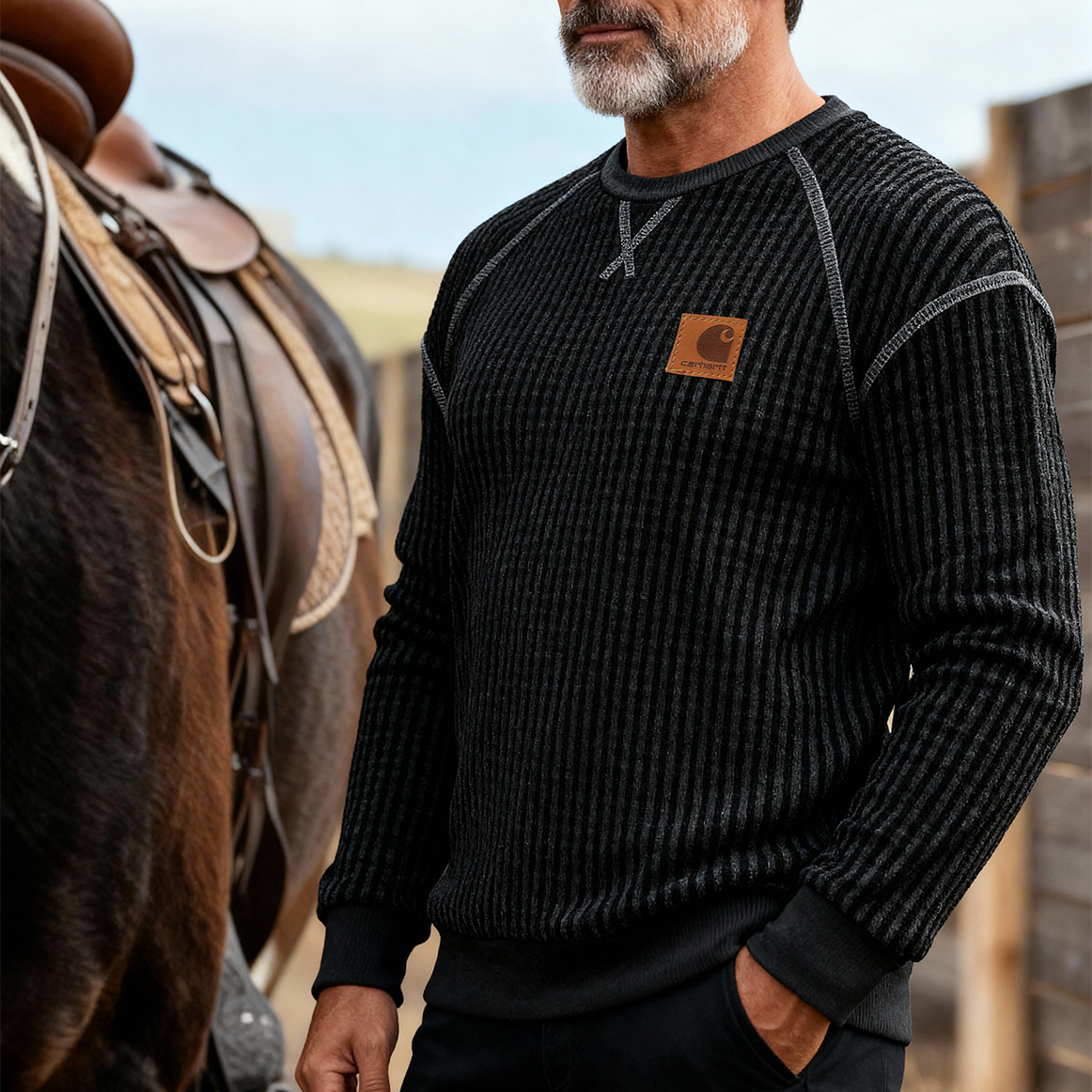 • Men's Vintage Black Waffle Knit Crewneck Long Sleeve Sweatshirt